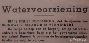 Rijnsburg 1944, de herfst van het vierde oorlogsjaar is een feit. Levensmiddelen zijn op de bon, een Vervangingskeuken is ingesteld in het dorp en het wordt voor de Rijnsburgers steeds moeilijker om de huishoudelijke eindjes aan elkaar te knopen. Na maatregelen op gas en elektra is nu de watervoorziening aan de beurt. Op 10 oktober 1944 verspreid Loco Burgemeester C.D. van der Vijver namens de Gemeente Rijnsburg een strooibiljet waarin hij aangeeft dat het beslist noodzakelijk is om de afname van water te verminderen. Het Rijnsburgse leidingwater is afkomstig uit de Katwijkse duinen en wordt geleverd door de . Technisch gesproken […]